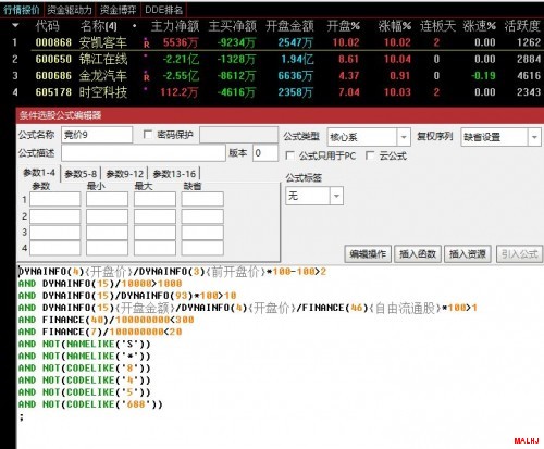 二:比如写一个竞价涨幅大2%,竞价金额大于1000万,竞价换手率大于1,非ST,非星号,非485开头,非科创板,流通市值小于300亿,流通盘小于20亿,开盘额比大于10%的条件公式如何编写呢?源码如下: